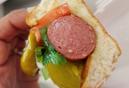 1/4-pound grilled all beef hot dog with tomatoes, pickle, sport peppers, onion and neon relish on a split top bun.